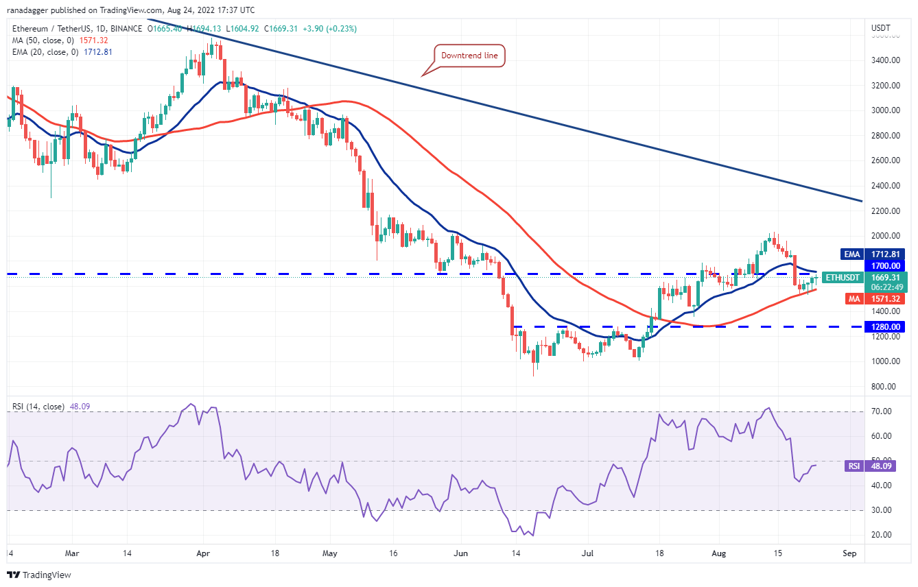 Os touros estão defendendo agressivamente a média móvel simples de 50 dias (SMA) (US$ 1.571), como visto na cauda longa nas velas de 22 e 23 de agosto. O Ether (ETH) agora tentará subir acima da EMA de 20 dias (US$ 1.712).