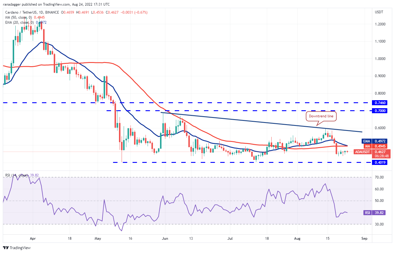 A ação do preço formou um padrão de vela contida no dia em 24 de agosto, indicando indecisão entre compradores e vendedores. Se os touros elevarem o preço acima de US$ 0,47, o par ADA/USDT poderá subir para as médias móveis. Um rompimento e fechamento acima dessa resistência pode abrir as portas para um possível rali para a linha de tendência de baixa.