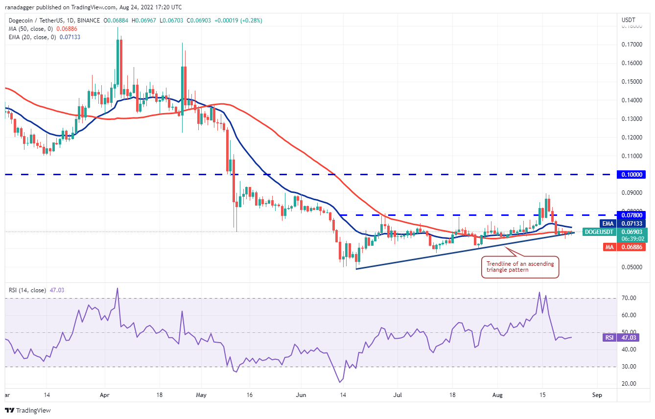 Dogecoin (DOGE) caiu abaixo da linha de tendência em 22 de agosto, mas os touros compraram a queda como visto na cauda longa no candle do dia. No entanto, um sinal negativo é que os touros não conseguiram eliminar a resistência de sobrecarga na SMA de 50 dias (US$ 0,07).