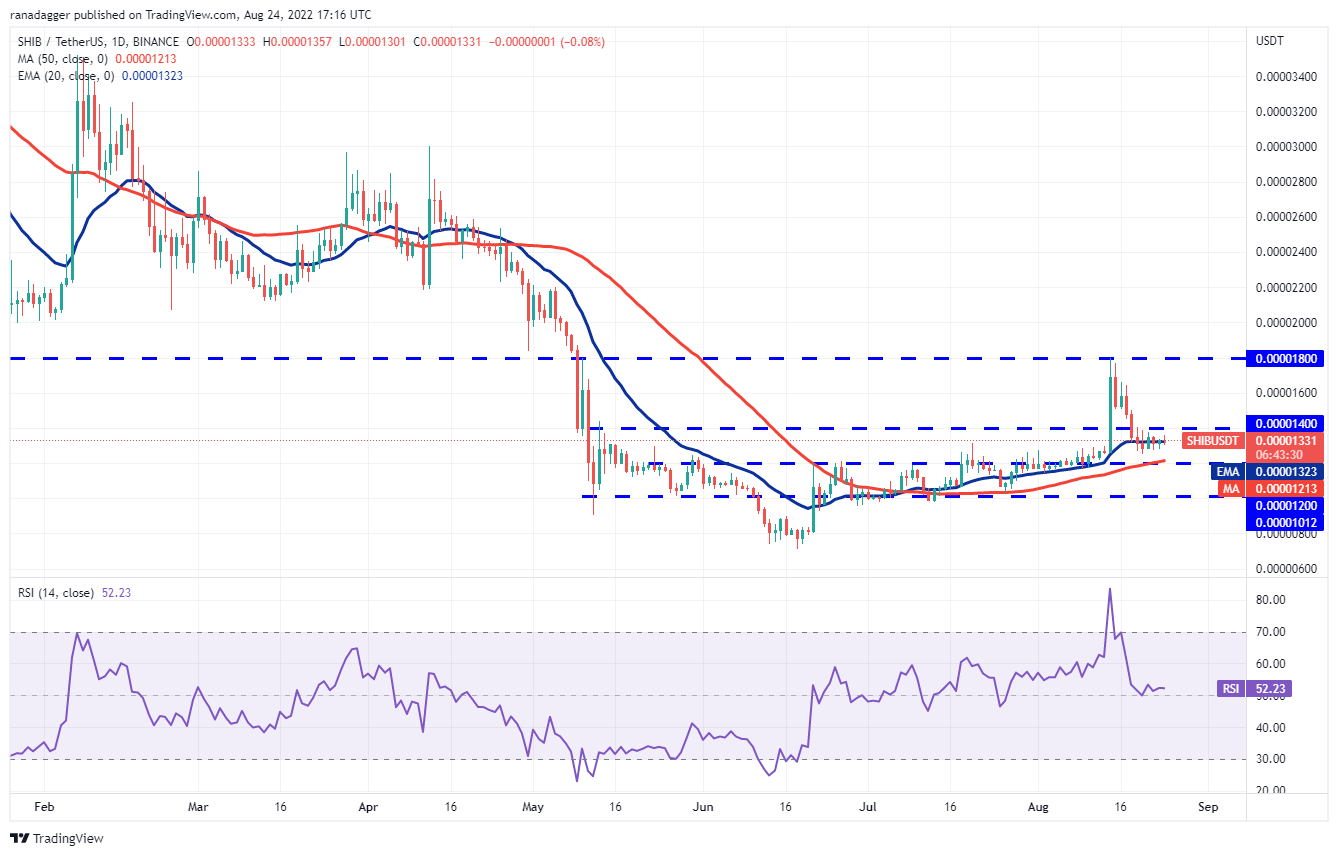 O Shiba Inu (SHIB) continua sendo negociado perto da EMA de 20 dias (US$ 0,000013) nos últimos dias, o que sugere um estado de indecisão entre os touros e os ursos.