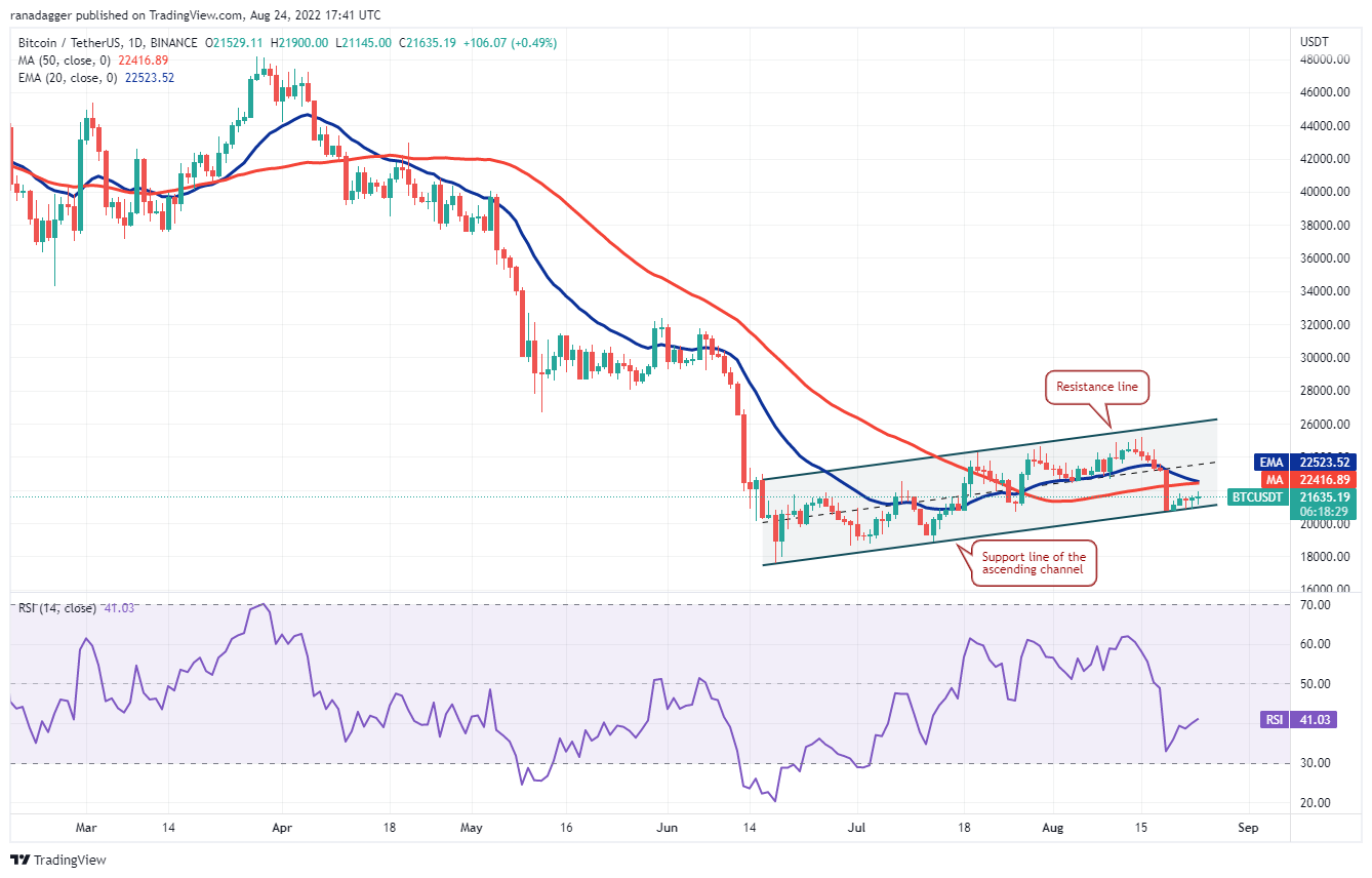 A média móvel exponencial de 20 dias (EMA) (US$ 22.523) começou a cair e o índice de força relativa (RSI) está próximo de 41, indicando que os ursos têm uma ligeira vantagem. Se o preço romper abaixo da linha de suporte do canal, a venda pode se intensificar e o par BTC/USDT pode cair para US$ 18.900.