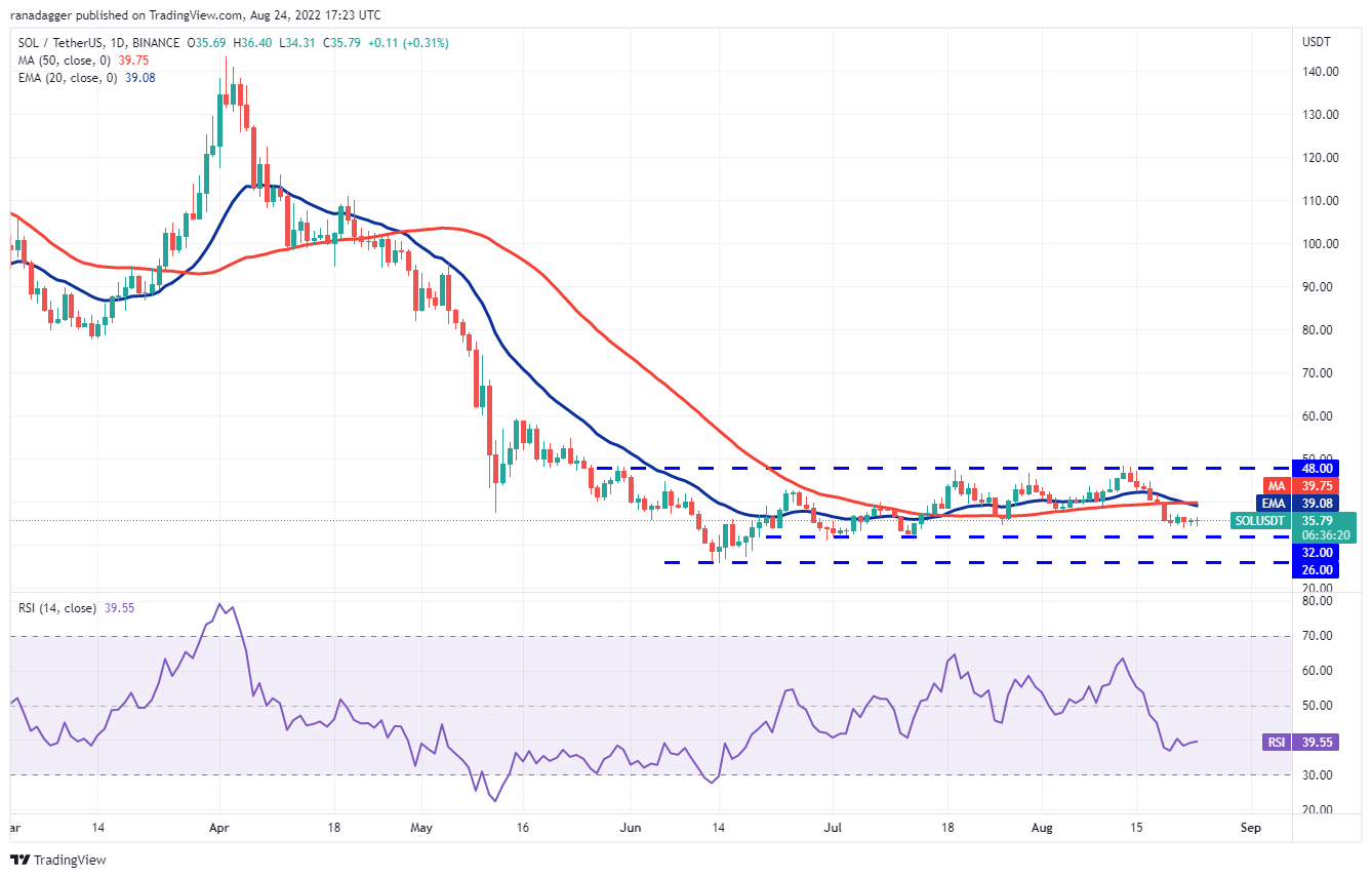 Os touros defenderam com sucesso o suporte de US$ 32 em duas ocasiões anteriores; portanto, o nível pode novamente atrair compradores. Se o preço se recuperar de US$ 32, os touros tentarão novamente empurrar o par SOL/USDT acima das médias móveis.