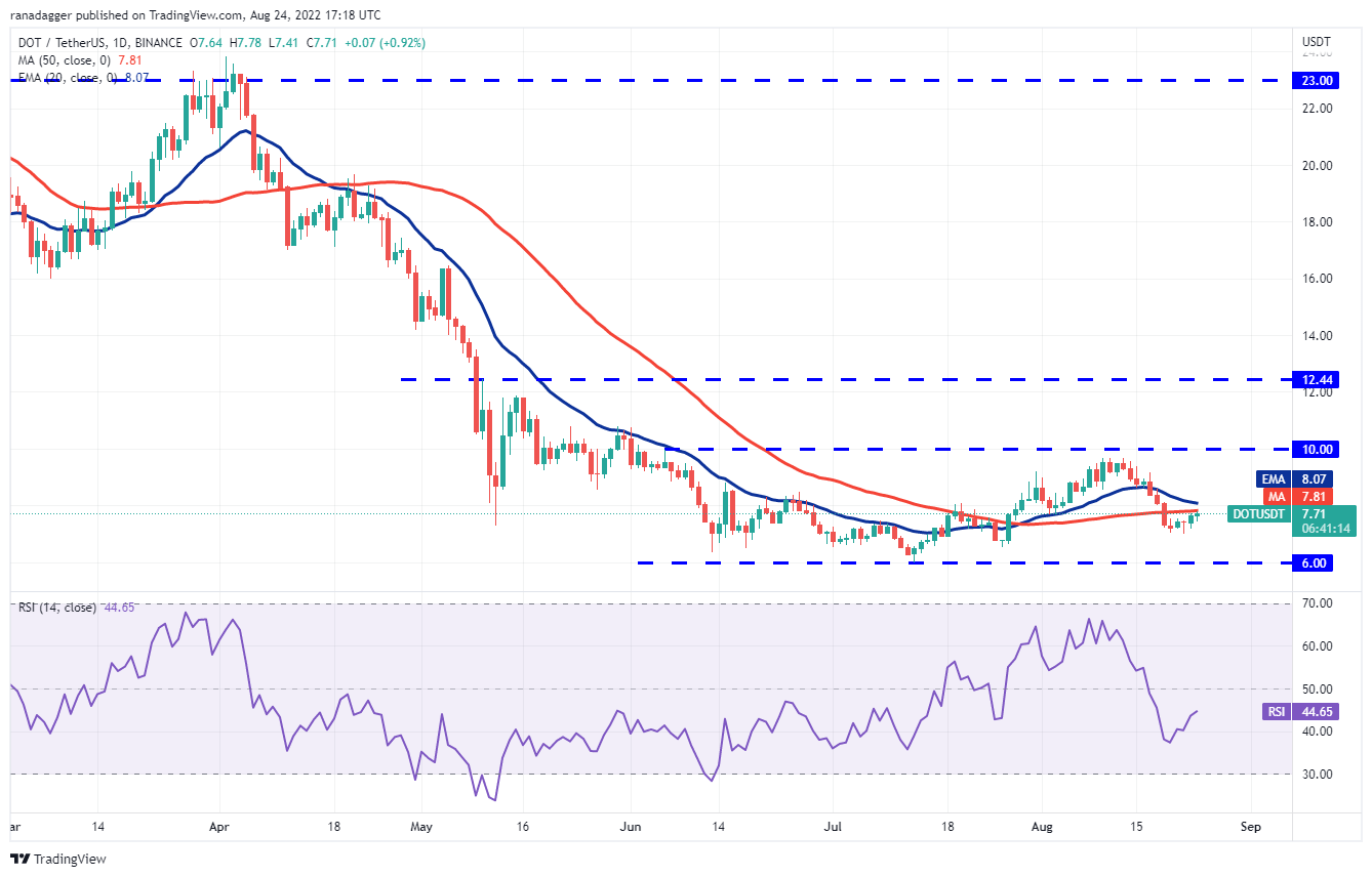Os touros terão que empurrar o preço acima da SMA de 50 dias e da EMA de 20 dias (US$ 8,07) para abrir caminho para um possível rali para US$ 9,17 e depois US$ 10. Este é um nível importante para ficar de olho porque um rompimento e fechamento acima dele pode sinalizar que o par DOT/USDT pode ter atingido o fundo. O par poderia então subir para a resistência aérea em US$ 12,44.