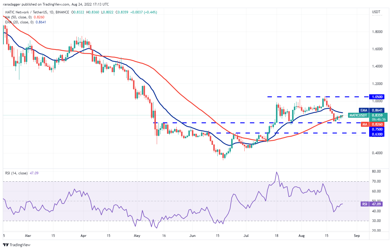 Se o preço cair da EMA de 20 dias, os ursos farão mais uma tentativa de afundar o par MATIC/USDT abaixo do nível crítico em US$ 0,75. Se isso acontecer, o par poderá deslizar para o próximo grande suporte em US$ 0,63.