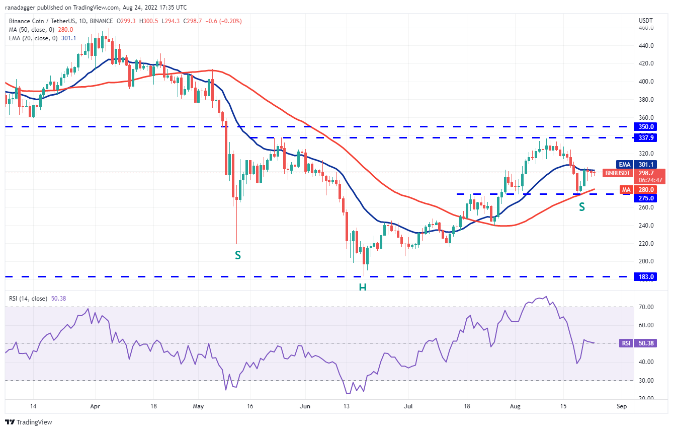 A recuperação do BNB do nível de US$ 275 tem enfrentado forte resistência na EMA de 20 dias (US$ 301). Um pequeno ponto positivo é que os touros não cederam muito terreno, pois esperam que o movimento ascendente continue.