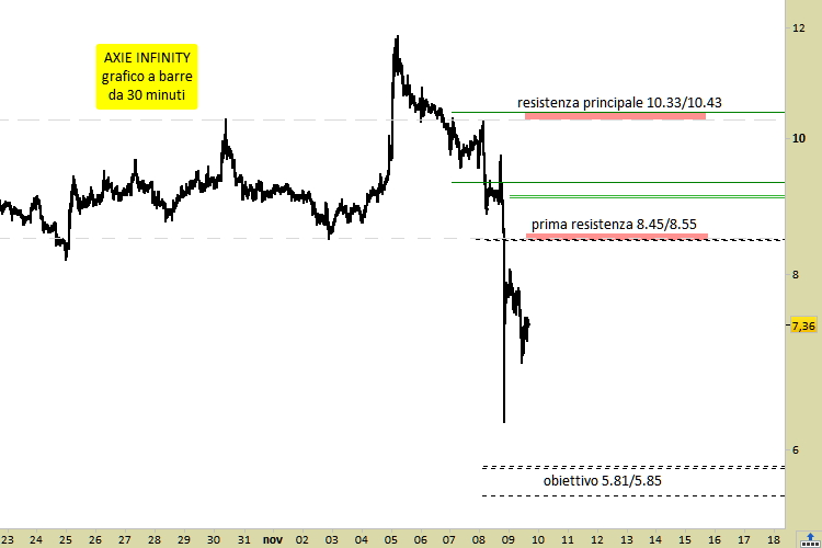 Il grafico a barre da 30 minuti evidenzia l’attuale disposizione delle resistenze non prima di 8.45/8.55 e 10.33/10.43. La rapidità del movimento ribassista è stata talmente elevata, che molti operatori semplicemente non hanno fatto in tempo ad intervenire. Di conseguenza molti possessori di Axie, che si sono trovati “incastrati” con posizioni rialziste aperte, stanno adesso correndo ai ripari piazzando ordini di vendita fra gli 8.50 ed i 10.50, nell’attesa che un rimbalzo possa consentirgli prezzi di uscita più vantaggiosi.