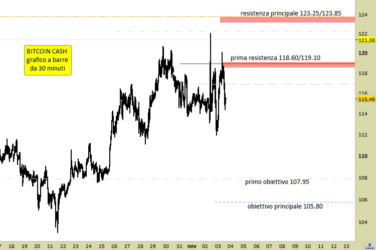 Le proiezioni legittimano aspettative di arretramento fino a 107.95 e 105.80. Il segnale tecnico è short su nuovi test delle resistenze, in ogni caso da rilevazioni non inferiori a 116.90; questo, allo scopo di intervenire solo quando il rapporto rischio/beneficio risulti il più possibile a nostro favore. Lo scenario verrebbe annullato e rivisto solamente nell’eventualità di rottura della resistenza principale, mediante una chiusura su grafico a 30 minuti superiore a 123.85. Quando sono le 14.21 CET di giovedì 3 novembre, BCH viene scambiato sui migliori exchanges mondiali a 115.61, in guadagno del +1.78% su base giornaliera.