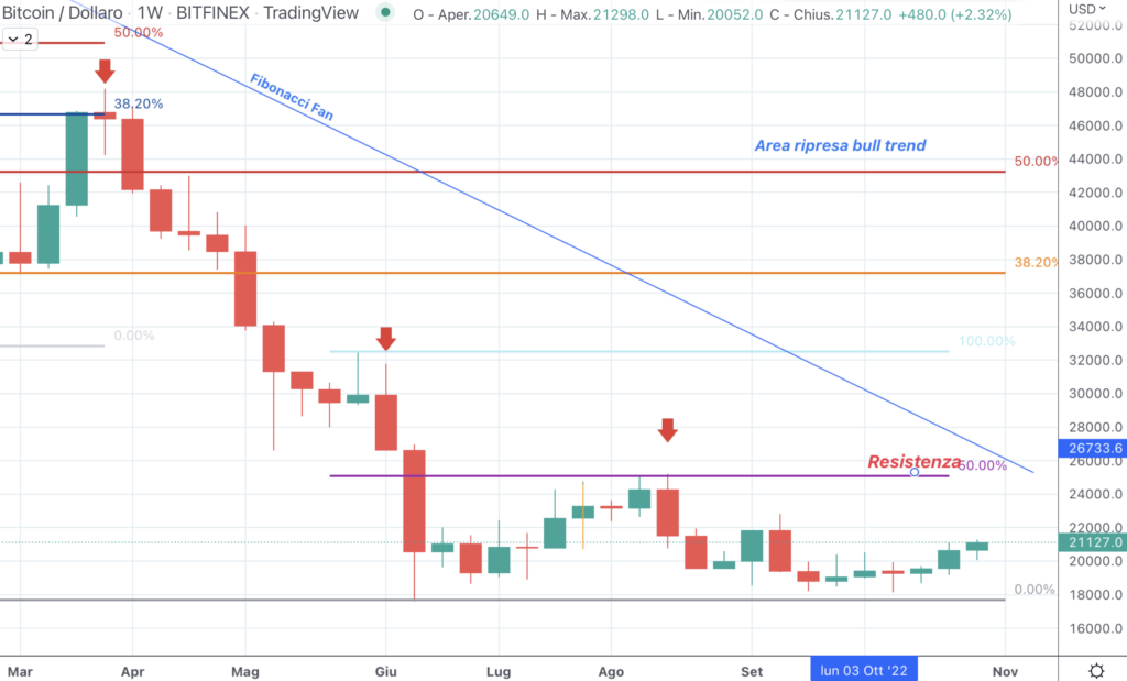 Dando uno sguardo al grafico weekly di Bitcoin, possiamo vedere che con il superamento di 21700$ l’obiettivo successivo è l’arrivo verso i massimi di Agosto a 25200$, da dove è partita la correzione. Anche questo livello di prezzo corrisponde al livello 50% di Fibonacci, ma del vettore superiore che va da 32500$ fino ai minimi di Giugno. Anche questo caso però possiamo vedere che il livello 50% è stato spartiacque ed ha dato il via alla correzione partita a metà Agosto.A livello di supporto deve restare sopra l’area 20000-19750$