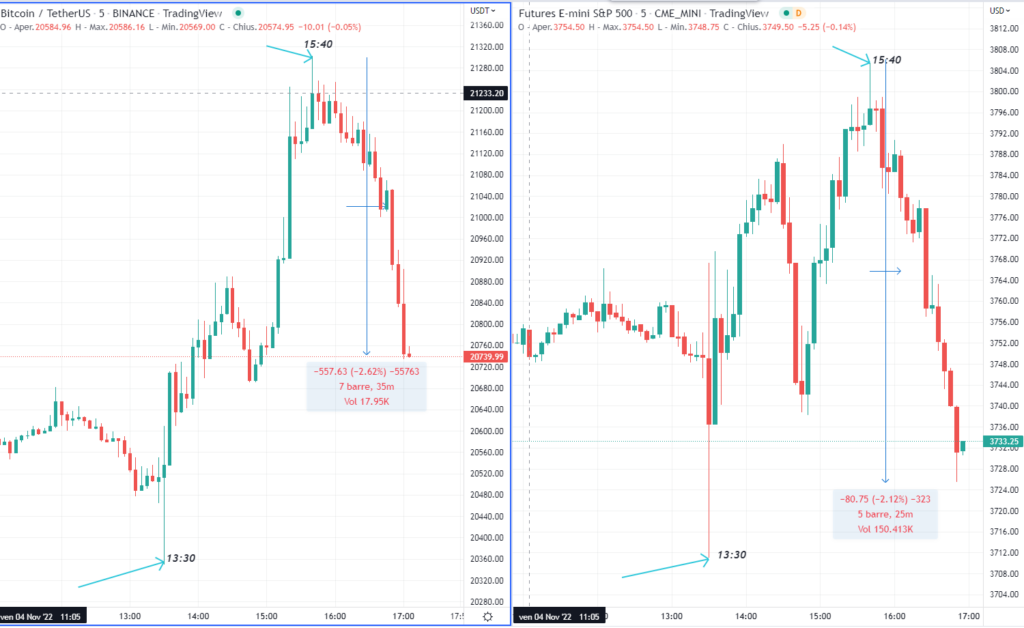 Nel grafico seguente, abbiamo la prova della correlazione e del fatto che probabilmente gli HFT (high frequency trading) sono tarati al medesimo modo per entrambi. Sul grafico a 5 minuti, sono messi in parallelo l’andamento del Bitcoin e del future su SP500, a partire dalle ore 11 di ieri, 4 Novembre. Si può notare come alle 13:30 entrambi abbiano accelerato al rialzo ed alle 15:40 abbiano virato contemporaneamente al ribasso.
