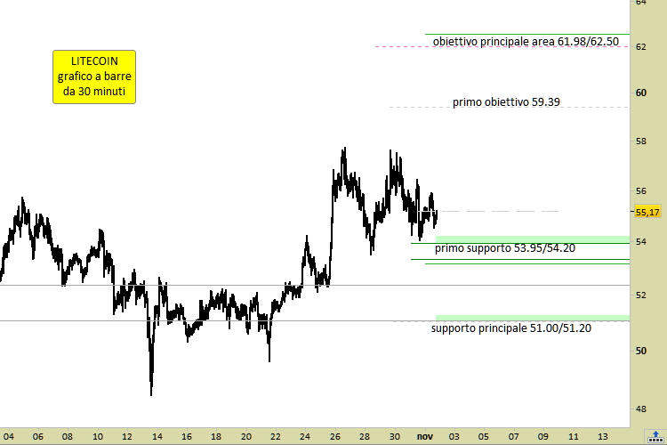 Lo scenario descritto verrebbe annullato e rivisto solo nell’eventualità di rottura del supporto principale, mediante una chiusura su grafico a 30 minuti inferiore a 51.00. Nel frattempo, quando sono le 19.15 CET di martedì 1° novembre, LTC viene scambiato sui migliori crypto exchanges mondiali a 55.19 dollari, in aumento del +0.29% su base giornaliera.