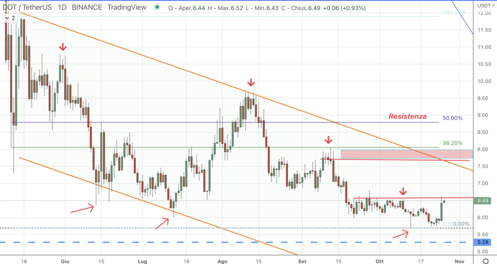 Tagliando il tempo, scendiamo su un grafico daily ed analizziamo maggiormente nel dettaglio questo ultimo periodo di Polkadot. A differenza di molte coins che si sono mosse in laterale, negli ultimi mesi, creando dei box range, DOT è sostanzialmente scesa, creando un canale ribassista, come evidenziato.