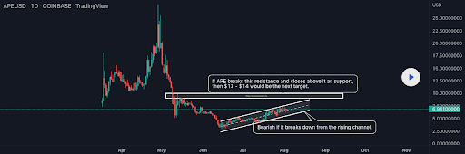 L’ultimo grafico che osserviamo oggi è il grafico a 1 giorno APE/USD di LA_Designer. Il prezzo di APE è scambiato in un canale ascendente da circa un mese.
