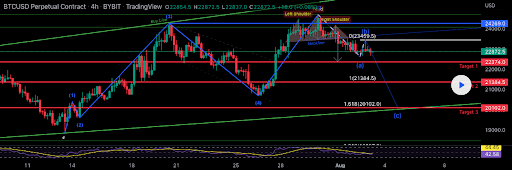 Il grafico sottostante indica che il prezzo di BTC sta formando un modello di testa e spalle sul time frame a 4 ore. Il primo obiettivo al ribasso è [$22.374.] seguito da 1 [$21.384,5] e 1,618 [$2.102.].