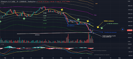 Il secondo grafico di rilievo di martedì è il grafico ETH/USD a 1 giorno di MiserableToppings. Il prezzo di Ether ha realizzato un engulfing rialzista sulla MA 300W (media mobile a 300 settimane) e, in seguito a questo rimbalzo, è tornato rapidamente sopra il livello di $1k.