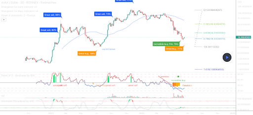 Il terzo grafico che osserviamo oggi è il grafico AVAX/USD a 3 giorni di without_worries. Il prezzo di AVAX è scambiato tra il livello 0,786 fib [$16,32] e 0,618 [$24,21], al momento della scrittura.