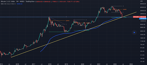 Il primo grafico di oggi è il grafico BTC/USD a 1 settimana di BDTrading. Il prezzo di BTC ha chiuso appena al di sopra di una trendline storica di 8 anni a 18.314,35 dollari.