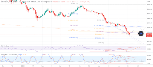 Il secondo grafico che analizziamo oggi è il grafico ETH/USD a 1 giorno di cryptoinnovateur. Il prezzo di ETH è scambiato tra 0,618 [$934,70] e 0,5 [$1.168,93], al momento della scrittura.