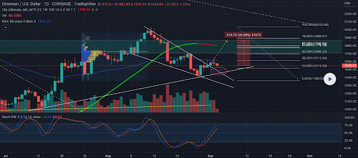 Il grafico a 1 giorno di ETH/USD qui sotto, realizzato da EdgarTigranyan, è il secondo grafico che analizziamo per questo lunedì. Il prezzo di ETH è scambiato tra il livello fib del 23,60% [1.516,39$] e il 38,20% [$1.615,30], al momento della scrittura.