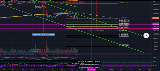 Il primo grafico che esploriamo oggi è il grafico a 1 giorno di BTC/USD di q2sandman. Il prezzo di BTC è scambiato appena sotto il livello di $19k, al momento della scrittura.
