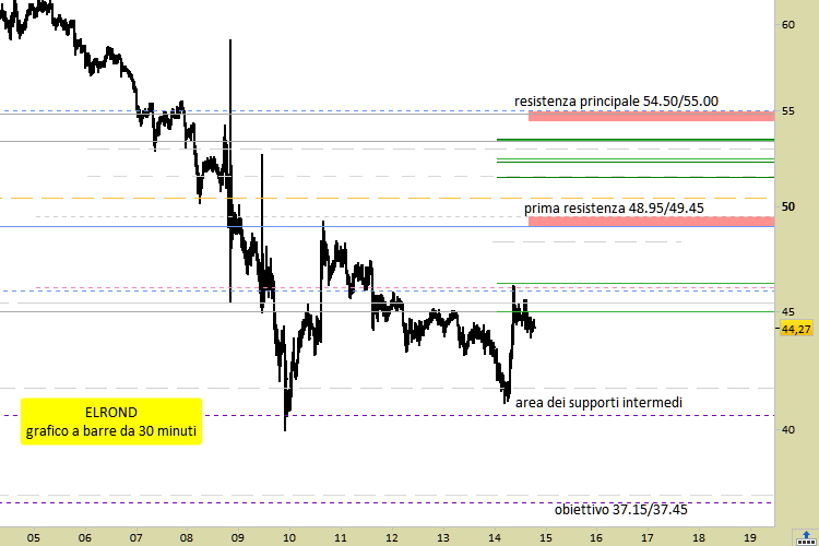 Durante questo fine settimana Elrond ha cercato di effettuare un recupero, ma finora non si sono formate indicazioni di inversione al rialzo, per cui dobbiamo considerare ancora dominante il quadro ribassista. Quello che invece si è formato sono due nuove resistenze, visibili su grafico a barre da 30 minuti, posizionate a 48.95/49.45 ed a 54.50/55.00. Entrambe le resistenze costituiranno punti di probabile ripresa del ribasso in caso di recuperi, soprattutto se entro la fine della settimana in corso (=domenica prossima, 20 novembre).
