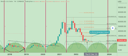 Il grafico di BTC/USD a 1 mese di FiboSwanny è il primo grafico che analizziamo per questo giovedì.
