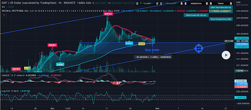 Il grafico indica che il prezzo di QNT si trova in una zona di acquisto con un range di $140-$161 sulla scala temporale a 4 ore.