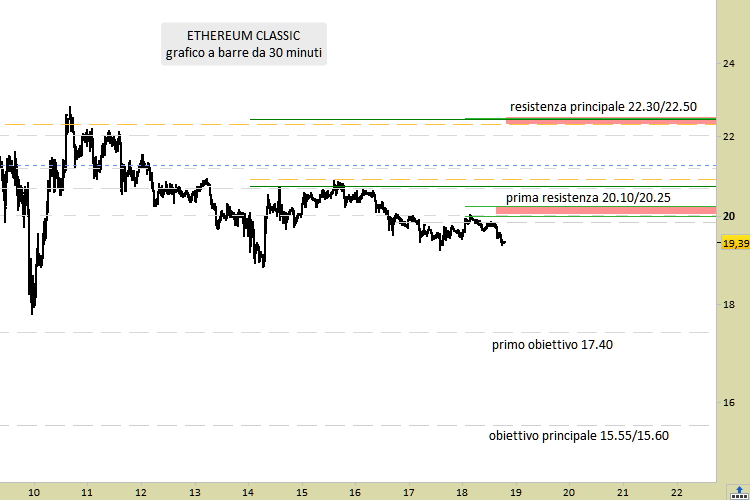 Le proiezioni fissano un target principale a 15.55/15.60, da raggiungere passando per un primo obiettivo intermedio a 17.40. Il segnale tecnico è short solo su nuovi test delle resistenze, in ogni caso da rilevazioni non inferiori a 19.85. Lo scenario tecnico verrebbe annullato e rivisto solo nell’eventualità di rottura rialzista della resistenza principale, mediante una chiusura su grafico a 30 minuti superiore a 22.50. Mentre sono le 19.04 CET di venerdì 18 novembre, ETC viene scambiato sui migliori exchanges mondiali a 19.38 dollari, in calo del -1.42% su base giornaliera.