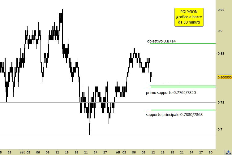 Proprio oggi abbiamo approfondito un aspetto legato ad un ulteriore sviluppo dell’ecosistema di Polygon. Vediamo adesso quali sono state le ripercussioni tecniche della notizia sui prezzi aggiornati. Su grafico a barre da 30 minuti possiamo isolare a quota 0.7762/7820 ed a quota 0.7330/7368 i supporti, punti di probabile reazione dei prezzi in caso di arretramenti, soprattutto se entro la fine della settimana in corso. All’atto di fissare le proiezioni rialziste dobbiamo fare un passo alla volta, in quanto esiste una fitta sequenza di resistenze che ancora si oppongono alla ripresa del rialzo con continuità.
