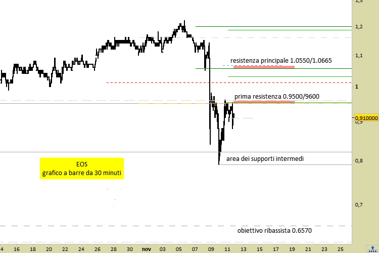 A quota 0.8200 e quota 0.7900 sono posti adesso i supporti di breve periodo. Le probabilità pendono verso la formazione di una fase distributiva fra i supporti e le resistenze, mediante ripetuti cambi di tendenza preparatori alla rottura ribassista. Le proiezioni fissano un target di tendenza 0.6570. il segnale tecnico è short su nuovi test delle resistenze, in ogni caso da rilevazioni non inferiori a 0.9095. Lo scenario descritto verrebbe immediatamente archiviato solo nell’eventualità di rottura della resistenza principale, mediante una chiusura su grafico a 30 minuti superiore a 1.0665. Quando sono le 19.43 CET di venerdì 11 novembre, EOS viene passato di mano sui migliori exchanges mondiali a 0.9100 dollari, in calo del -3.19% su base giornaliera.