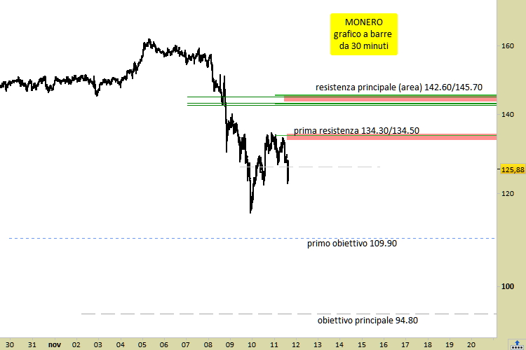Il segnale tecnico è short su ritorni alle resistenze, in ogni caso da rilevazioni non inferiori a 126.30. Vogliamo evitare di intervenire a mercato da prezzi troppo bassi, per cercare di ottenere un teorico rapporto rischio/beneficio il più possibile favorevole. Lo scenario verrebbe annullato dall’eventuale rottura rialzista di quota 145.70, con una chiusura su grafico a 30 minuti. Mentre sono le 16.04 CET di venerdì 11 novembre, XMR viene passato di mano sui migliori exchanges mondiali a 125.57, in calo del -5.55% su base giornaliera.