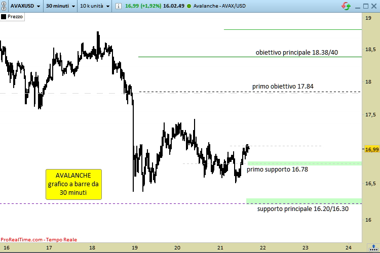 Per un posizionamento operativo che tenga conto di un rapporto rischio/beneficio il più possibile a favore, seguiremo Avalanche con posizioni long preferibilmente su ritorni dei prezzi almeno sul primo supporto, ed in ogni caso da rilevazioni non superiori a 17.04. Lo stop per lo scenario descritto scatterebbe in caso di violazione del secondo supporto, mediante una chiusura su grafico a 30 minuti inferiore a 16.20.
