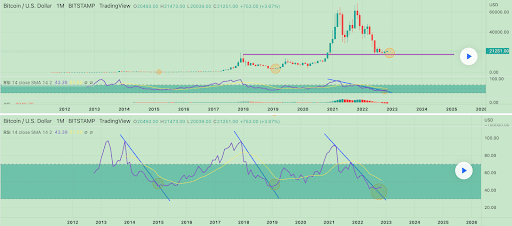 A parte l’ovvio accumulo tra il livello di $17.611 e il livello di $20k negli ultimi mesi, il grafico sottostante mostra che l’RSI su scala mensile ha rotto la sua tendenza al ribasso.