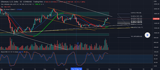 Il grafico a 1 giorno di ETH/USD di EdgarTigranyan è il secondo grafico che analizziamo per questo lunedì. Il prezzo di ETH è scambiato tra il livello di fibonacci del 38,20% [$1.562,51] e il 23,60% [$1.651,52], al momento della scrittura.