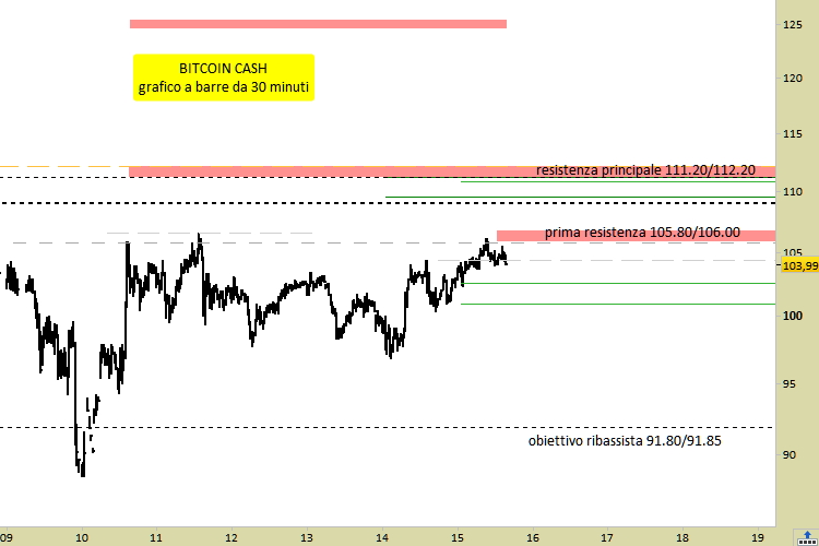 Le resistenze si sono portate a 105.80/106.00 ed a 111.20/112.20, punti di probabile ripiegamento in caso di nuovi rialzi, soprattutto entro la fine della settimana in corso (=domenica 20 novembre). Le aspettative sono di rottura dei supporti intermedi situati a 102.50 e 100.90, a favore di un affondo fino a 91.80/91.85. Solo dopo il raggiungimento di quest’ultimo livello attenderemo segnali dai prezzi per verificare, con le prossime analisi, se ci siano margini per intervenire long. Lo scenario descritto verrebbe annullato dall’eventuale rottura della seconda resistenza, con una chiusura su grafico a 30 minuti superiore a 112.20. Quando sono le 16.06 CET di martedì 15 novembre, BCH viene scambiato sui migliori exchanges mondiali a 104.09 dollari, con un leggero rialzo del +0.38% da ieri.