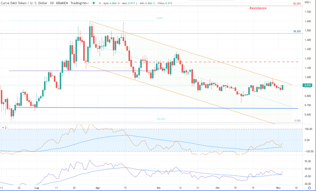 Tagliando il tempo, scendiamo su un grafico daily, dove possiamo osservare i movimenti degli ultimi mesi. In questo frangente il vettore che comanda è quello che va dai massimi a 3.052 fino al minimo a 0.536$. Con l’utilizzo dei ritracciamenti di Fibonacci vediamo che dai minimi Curve è riuscita a rimbalzare fino al primo obiettivo ad 1.455$. Però qui il prezzo si è bloccato ed ha iniziato a virare verso il basso.