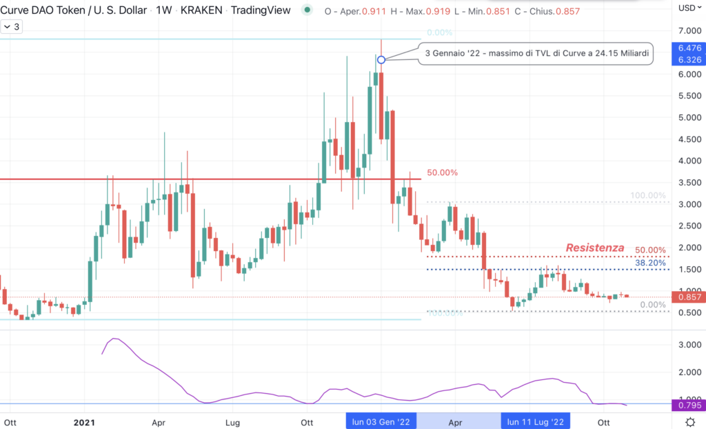 Dal seguente grafico su base weekly, possiamo vedere che Cruve ha toccato i suoi massimi a 6.80$ ad inizio di questo Gennaio 2022. Il massimo è corrisposto con il record di risorse bloccate (TVL di 24.15 Mld) presso i suoi servizi di DEX. Dai massimi, in 6 mesi CRV è scesa del 92%, arrivando al minimo di 0.536$, lo scorso 13 Giugno.