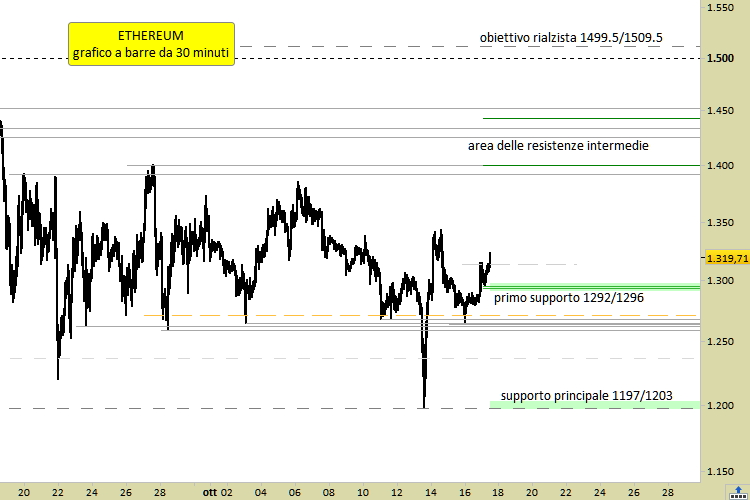 Il grafico a barre da 30 minuti evidenzia la formazione di supporti a 1292/96 e 1197/1203, probabili punti di reazione in caso di nuovi arretramenti in corso di settimana. Le proiezioni puntano ad un obiettivo situato fra 1499.50/1509.50. Sulla strada per il target principale sono poste delle resistenze, obiettivi intermedi, a 1393/1400 e 1440/45, punti da cui potrebbero scattare provvisori arretramenti in seno al rialzo atteso. Il segnale tecnico è long con prezzo limite 1313. Lo stop allo scenario scatterebbe in caso di semplice violazione del supporto principale a 1197, senza attendere alcuna conferma. Quando sono le 13.01 CET di lunedì 17 ottobre, ETH viene scambiato sui migliori exchenges mondiali a 1319.47, con un guadagno del +1.02% rispetto a domenica.