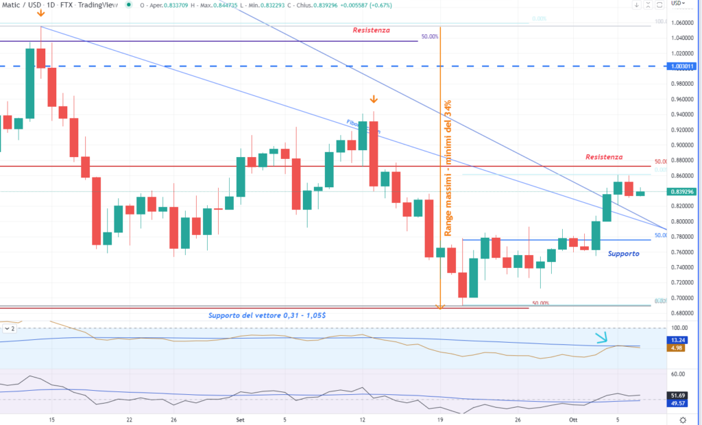 Nel grafico daily successivo, possiamo vedere l’andamento di Polygon negli ultimi 40 giorni è compresso nel vettore minore già citato in precedenza, tra 1,035 e 0,69$ che equivale ad un range del 35%, dall’alto verso il basso ed è quello che ci fornisce la resistenza a 0,873$.