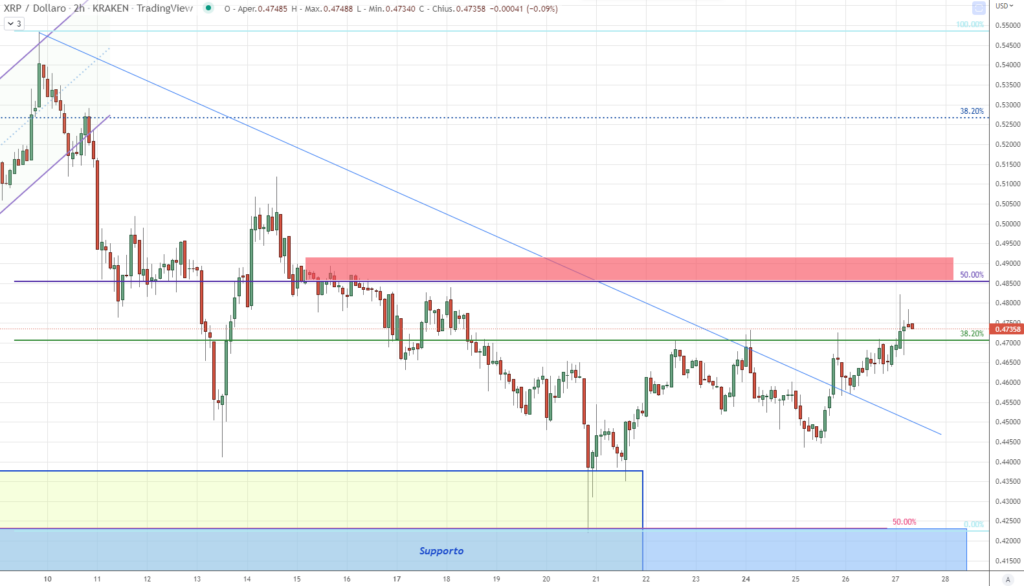 In questa fase di rimbalzo, il vettore che dobbiamo considerare è quello che va dai massimi relativi a 0.55970$ fino al minimo recente a 0.42250$. Con l’ausilio dei ritracciamenti di Fibonacci, procediamo all’individuazione dei due livelli fondamentali del 38.2 e del 50. Il prezzo di XRP corrisponde rispettivamente a 0.4707$ ed a 0.4855$.