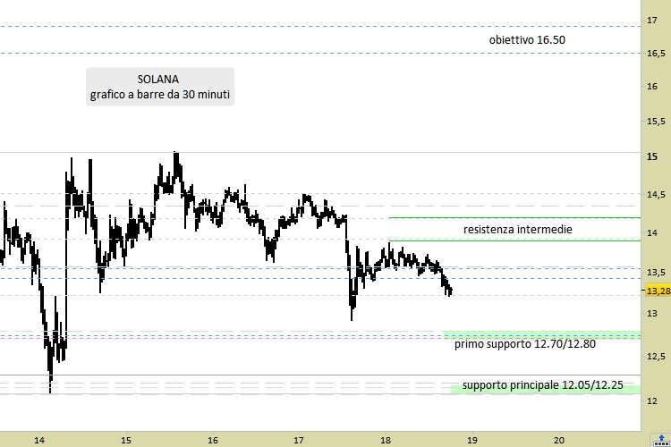 Il segnale tecnico in vigore è long su test dei supporti, in ogni caso da rilevazioni non superiori a 13.75. lo scenario verrebbe annullato solo dall’eventuale cedimento del supporto principale, mediante una chiusura su grafico a 30 minuti inferiore a 12.05. Possiamo premettere che, in caso di rottura ribassista, il livello di verifica immediatamente inferiore sarebbe localizzabile a 11.30. Mentre sono le 18.21 CET di venerdì 18 novembre, SOL viene scambiato sui migliori exchanges mondiali a 13.25 dollari, in calo del -2.78% su base giornaliera.
