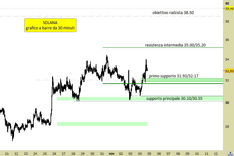 Il segnale tecnico è long su nuovi test dei supporti, in ogni caso da rilevazioni non superiori a 33.33. Lo scenario descritto verrebbe meno solo nell’eventualità di cedimento del secondo supporto, mediante una chiusura su grafico a 30 minuti inferiore a 30.10. Mentre sono le 18.28 di venerdì 4 novembre, SOL viene scambiato sui migliori exchanges mondiali a 32.83 dollari, in guadagno di un ottimo +3.63% su base giornaliera.