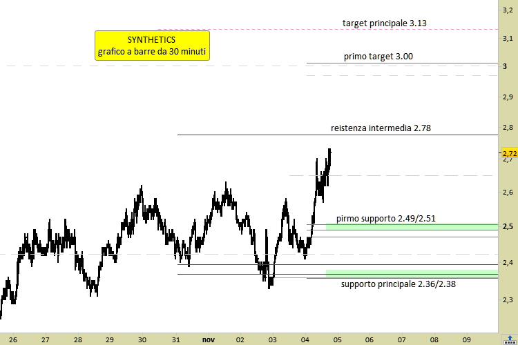 I supporti, livelli ove attualmente si stanno concentrando gli ordini di acquisto, sono localizzati a 2.49/51 e 2.36/2.38. Ognuno di essi costituirà potenziale punto di ripartenza del rialzo in caso di arretramenti, in particolare se entro la fine della prossima settimana (domenica 13 novembre). Sulla tenuta dei supporti poggiano le aspettative di successiva ripartenza rialzista, con conseguente rottura della resistenza, e prosecuzione del movimento fino agli obiettivi di quota 3.00 e quota 3.13.