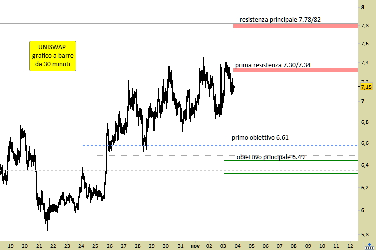 Le quotazioni di Uniswap Protocol Token (UNI) hanno raggiunto martedì scorso, 1° novembre, un picco relativo a 7.45, al culmine di una cavalcata rialzista che era cominciata dai minimi relativi del 21 ottobre a 5.83. Il +27.79% guadagnato in meno di 12 giornate rischia adesso di solleticare i venditori innescando delle prese di beneficio, in particolare da parte di quell’ampia fetta di traders che predilige l’operatività di breve/brevissimo periodo.