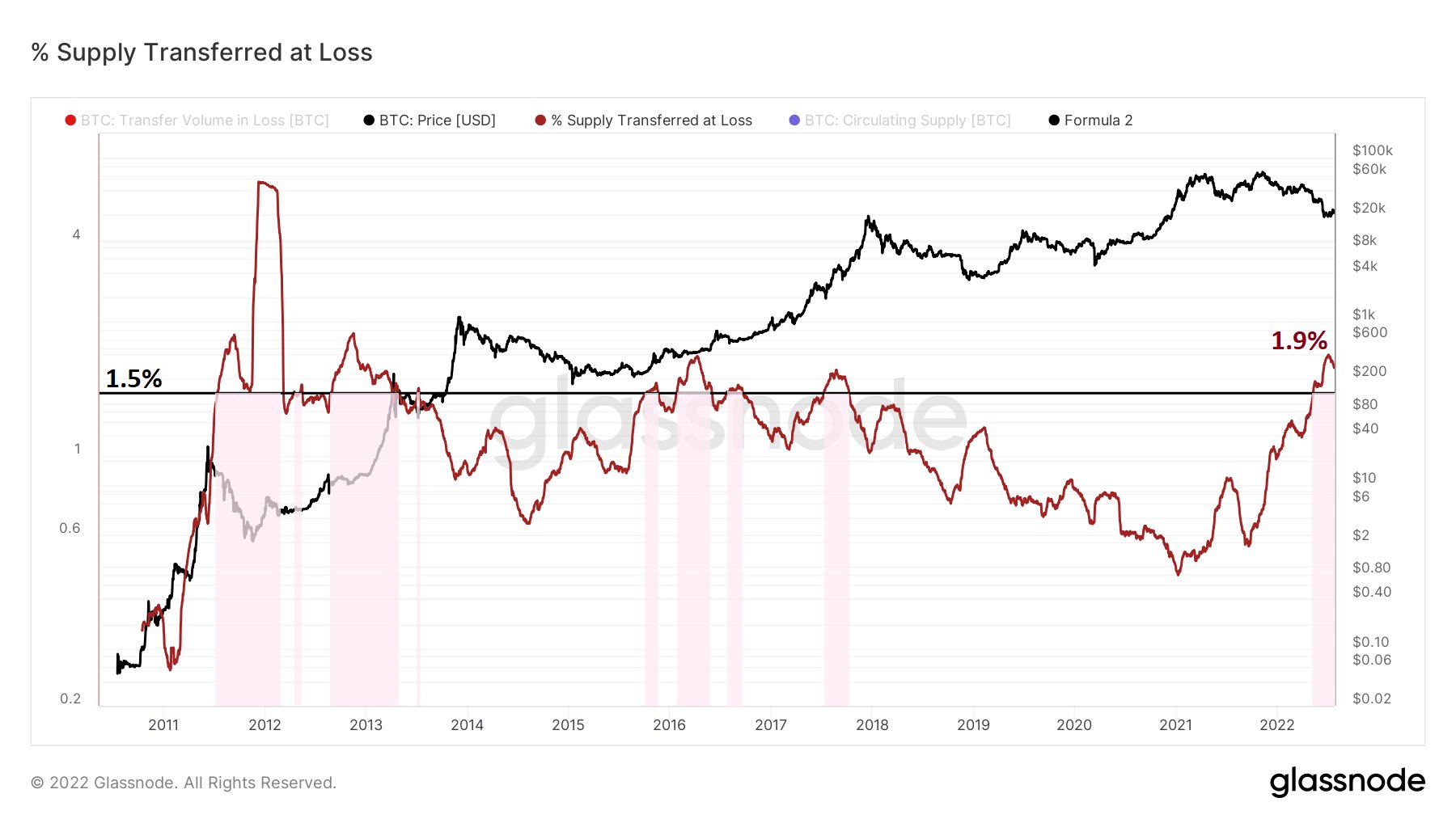 “El porcentaje del suministro total transferido con pérdidas alcanzó el 1.9% el mes pasado”, escribió junto a un gráfico de la firma de análisis on-chain Glassnode.