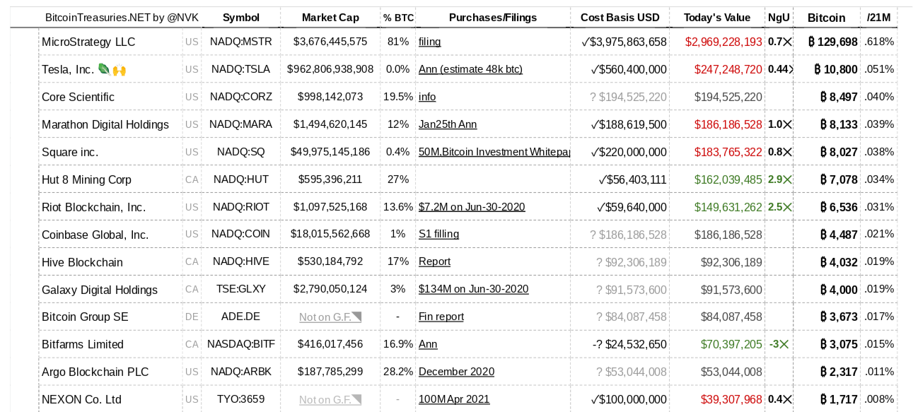 Según datos separados del recurso de monitorización Bitcoin Treasuries, Tesla sigue siendo la empresa pública con las segundas mayores reservas de BTC, pero ahora está muy por detrás del líder MicroStrategy y su reserva de 129,698 BTC.