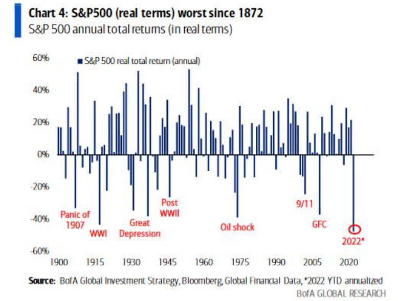 "Acabamos de ver las peores caídas ajustadas a la inflación en los mercados tradicionales en las últimas 8 generaciones. Ya es suficiente", continuó, señalando que el S&P; 500 había obtenido su peor rendimiento en términos reales desde 1872.