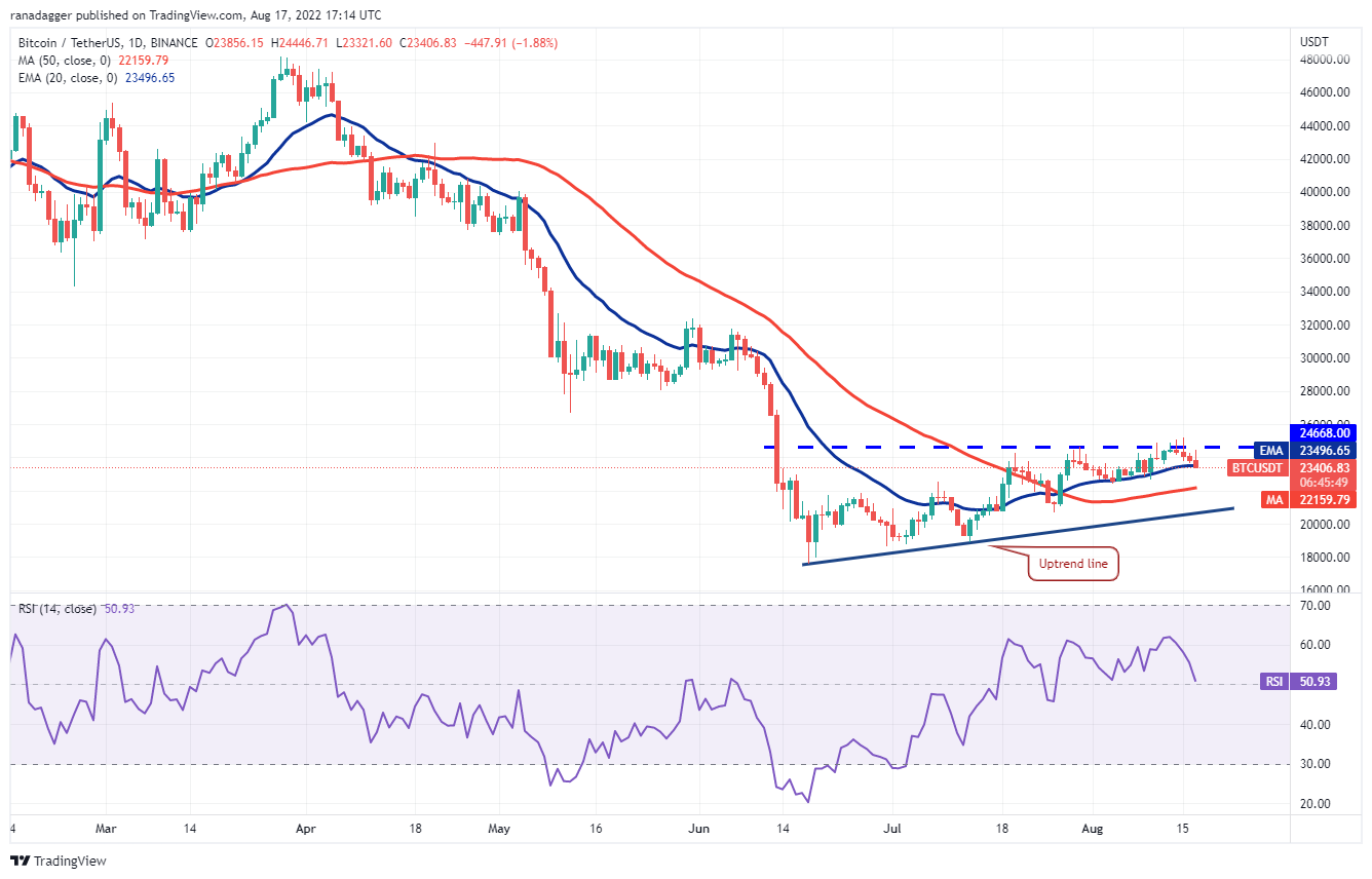 Los alcistas intentaron empujar a Bitcoin por encima de la resistencia superior a USD 24,668 el 17 de agosto, pero la mecha larga de la vela muestra que los bajistas están defendiendo el nivel agresivamente. El precio bajó y alcanzó el promedio móvil exponencial de 20 días (USD 23,496). Es probable que este nivel atraiga fuertes compras por parte de los alcistas.