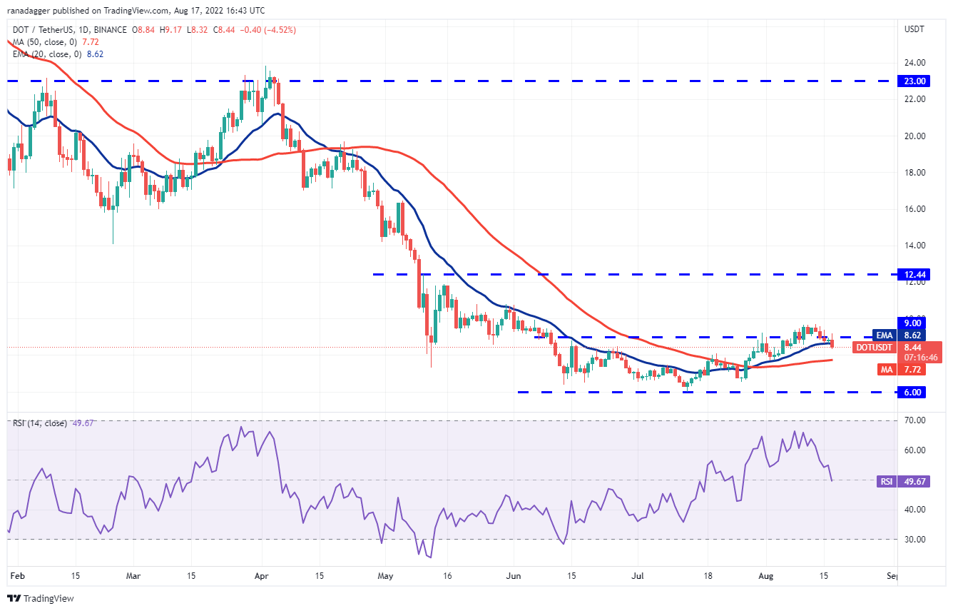 Los alcistas defendieron con éxito la EMA de 20 días (USD 8.62) el 15 y 16 de agosto, pero no pudieron lograr un fuerte rebote. Los intentos de los alcistas de empujar a Polkadot (DOT) por encima de la resistencia superior a USD 9 se encontraron con una fuerte resistencia el 17 de agosto.