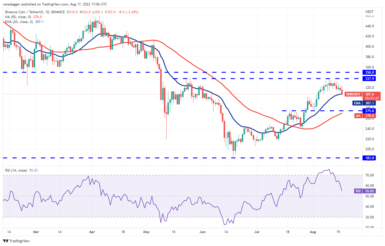 Los compradores intentaron impulsar Binance Coin (BNB) al alza el 17 de agosto, pero la mecha larga de la vela sugiere que los bajistas están activos en niveles más altos. Eso llevó el precio a la EMA de 20 días (USD 307).
