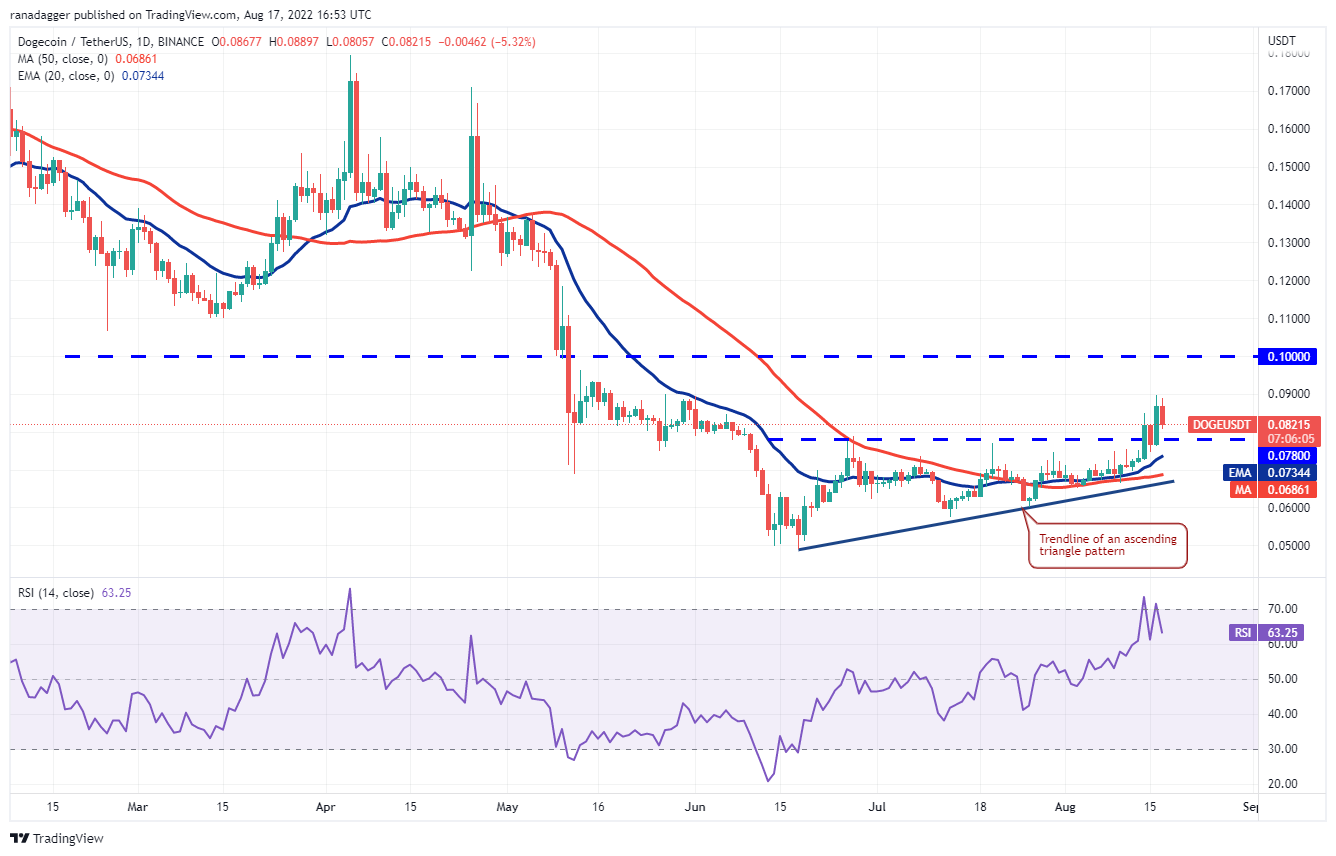 Los bajistas sacaron a Dogecoin (DOGE) por debajo del nivel de ruptura de USD 0.08 el 15 de agosto, pero no pudieron sostener los niveles más bajos. Los alcistas compraron la caída agresivamente y reanudaron la recuperación el 16 de agosto.